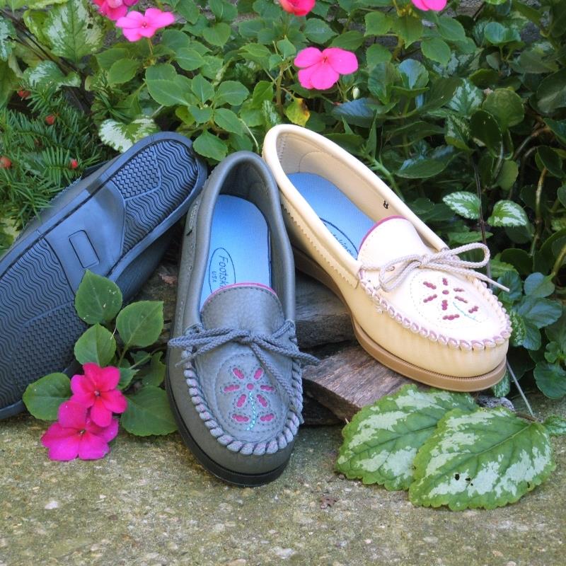 These comfortable shoes in either deertan or deerskin leather have our contoured insoles and flexible TPR soles.